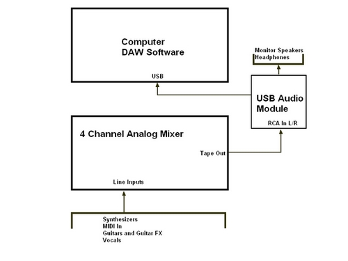 - The mixer lines out to a USB Audio module. For any home studio I recommend some kind of audio module, either USB or firewire. Never line directly into your sound card. An alternative is a mixer with USB / firewire connectivity, which eliminates the module requirement.